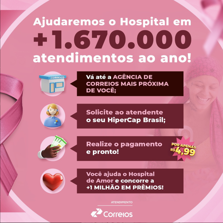 Durante o mês de outubro, o HiperCap Brasil reforça seu compromisso com as causas sociais, contribuindo ativamente para a luta contra o câncer de mama. Parte do valor arrecadado com a venda de títulos adquiridos nas agências dos Correios será destinada ao Hospital do Amor, uma das maiores referências no tratamento de câncer no Brasil, em apoio à campanha do Outubro Rosa.